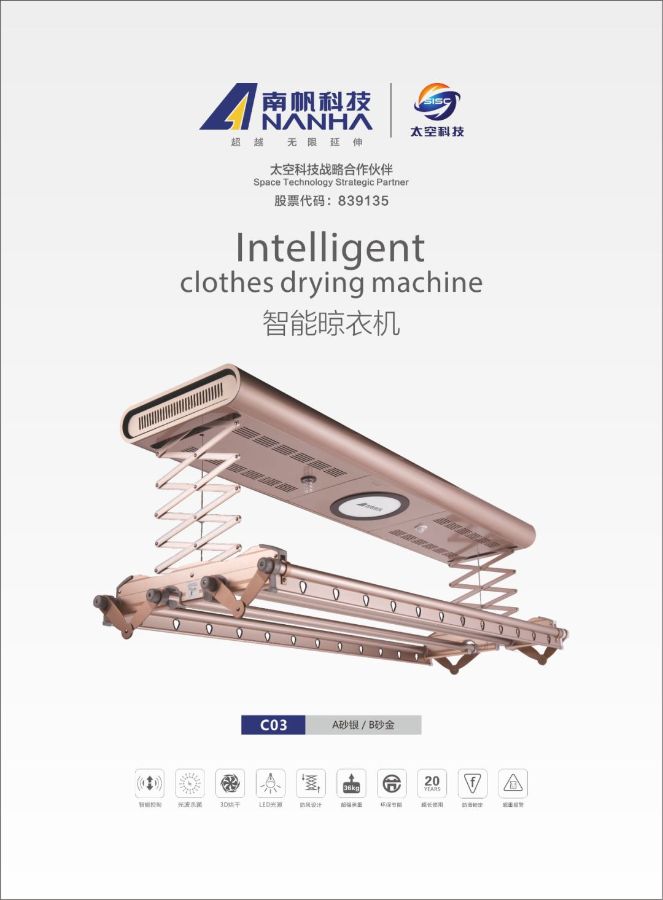 南帆科技智能晾衣機(jī)集智能遙控升降、健康照明、光波殺菌、人體感應(yīng)、3D熱風(fēng)速干、防風(fēng)擺設(shè)計(jì)等功能為一體,獨(dú)有十幾項(xiàng)專利技術(shù),為您提供智能+健康衣服晾曬解決方案。